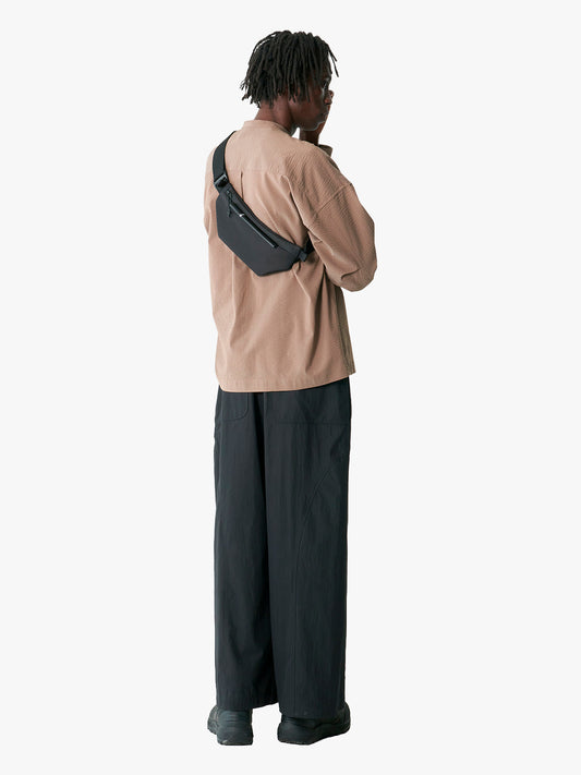 Sleek er et glat, vandafvisende nylonmateriale, der glider på kroppen og giver tasken en blød struktur, samtidig med at dens arkitektoniske form bevares.