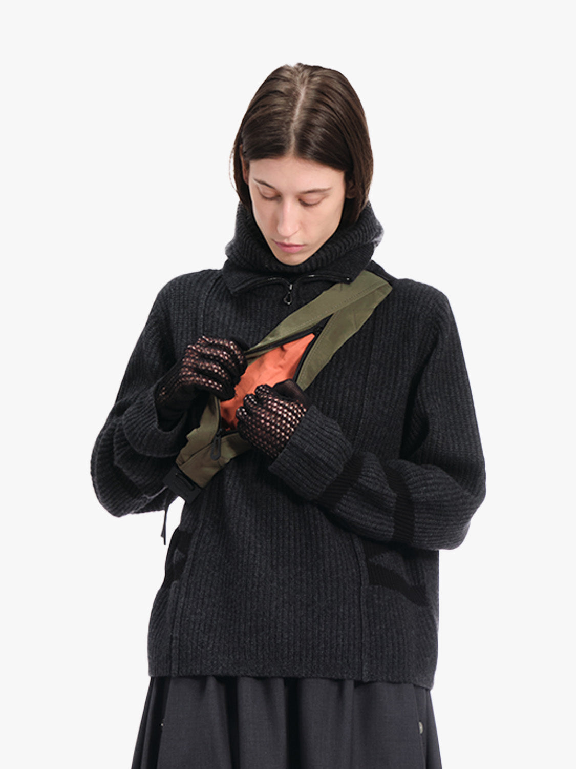 Hergestellt aus Cargo Green Nylon, zeigt der neueste ADDA gesteppte Nähte und ein kräftiges orangefarbenes Innenfutter beim Öffnen der Tasche, Details, die mit der ikonischen Bomberjacke synonym sind.