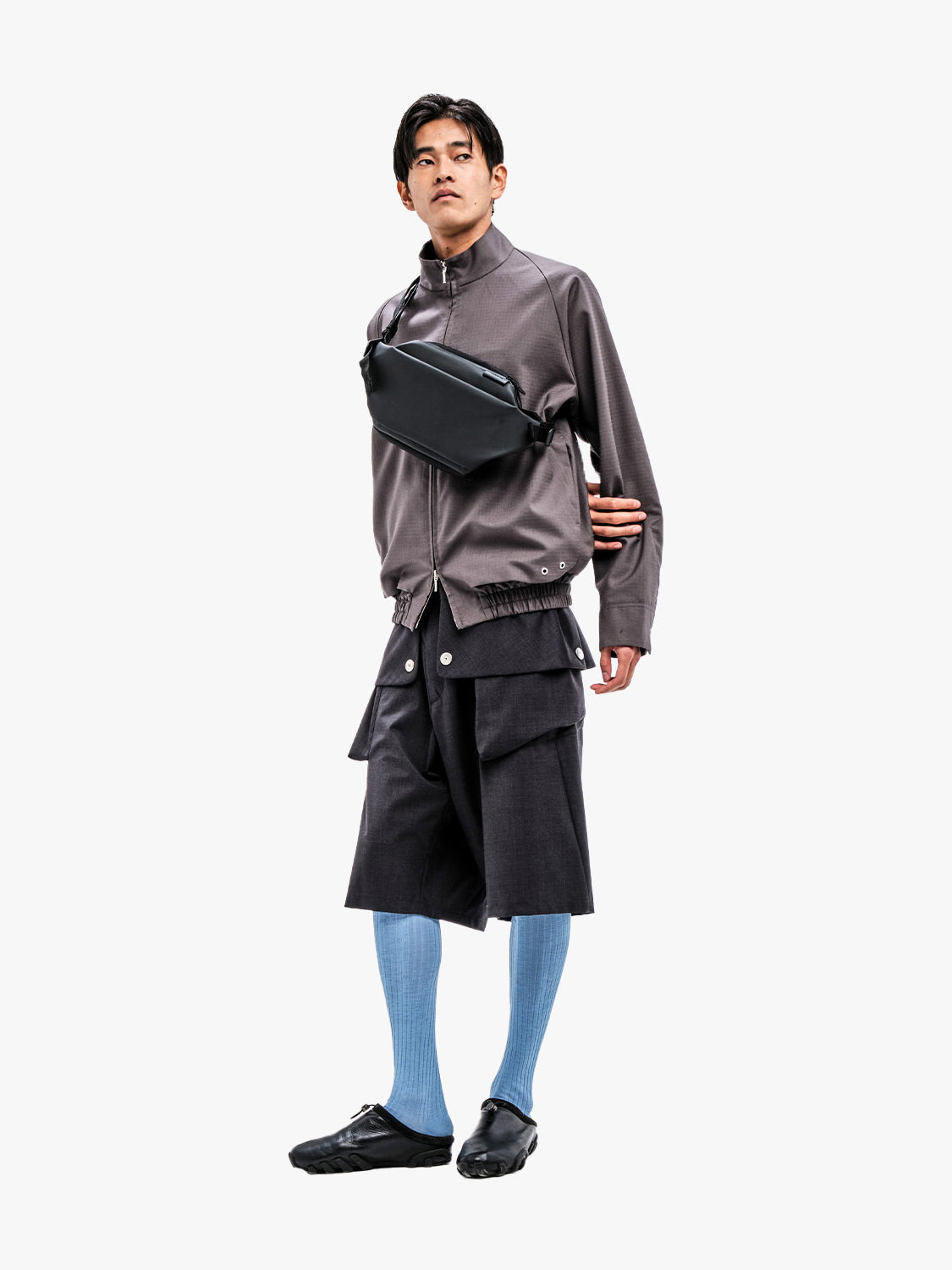 The front of this Isarau S is constructed from black Obsidian, the back from black EcoYarn. Internally, the Isarau S Obsidian Black features a black interior lining with two main compartments, a padded device pocket which closes with a magnetic tab and a zipped pocket. In addition, this sling bag features black zips and straps and matt black metal trims.