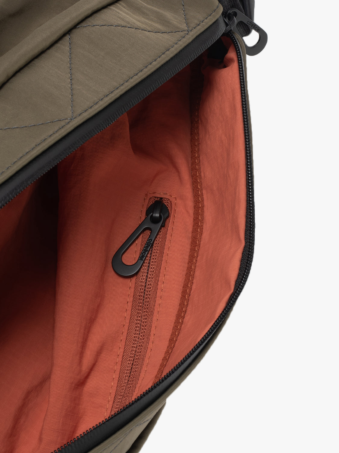 The main compartment is secured using a water-repellent zipper. There is an external hardware plate with embossed côte&ciel branding, a hidden pocket and a loop to attach a LetGo keychain.
