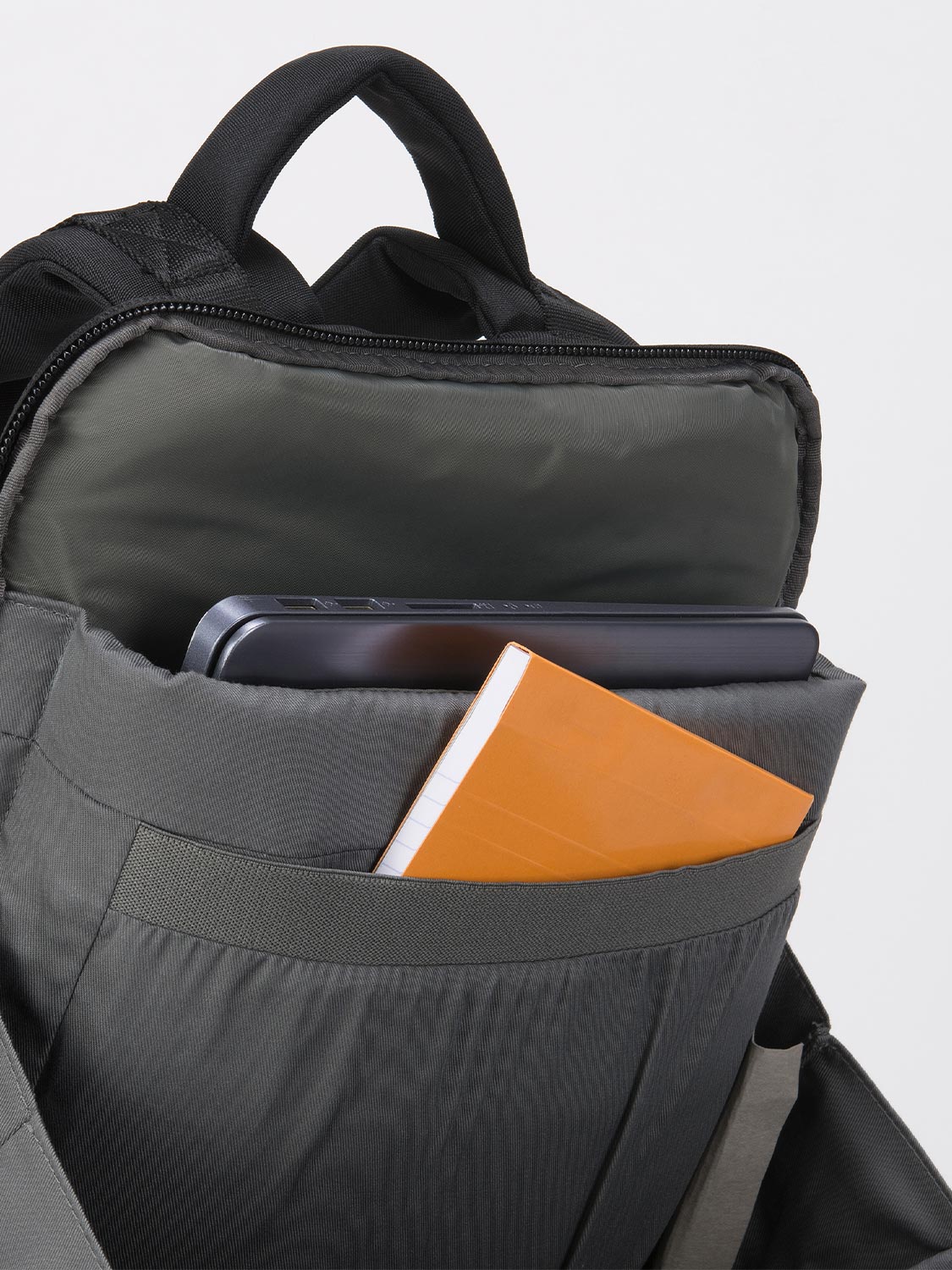 The body of the rucksack is made from a black EcoYarn - a durable fabric developed through sustainable processes. The bag’s minimalist exterior is completed by a contrasting grey inner compartment and lining.